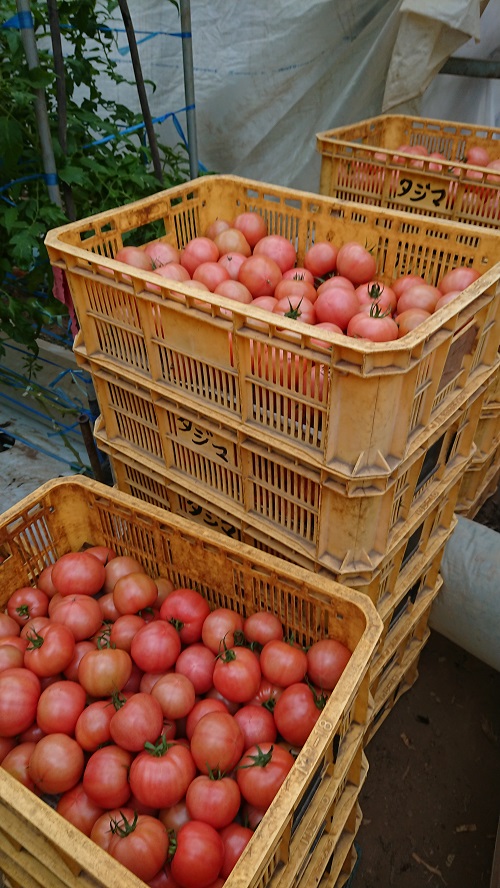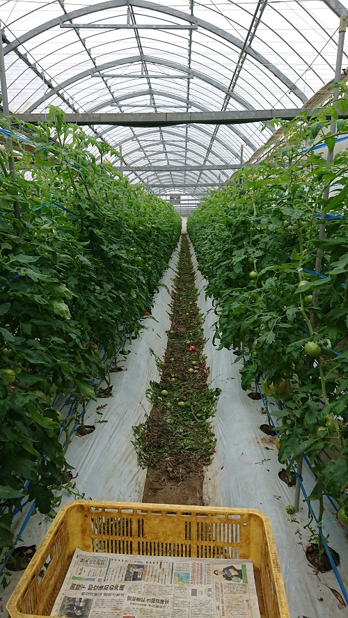 今回は組合員Tさんのハウスに訪問。トマトの収穫後、余分な葉を落とす作業中でした。