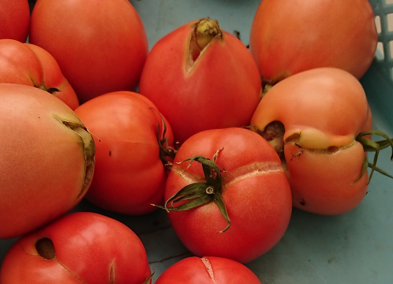 受粉が進まなかったり、生育そのものが止まってしまったり、割れが起きたり、でべそになったりです。